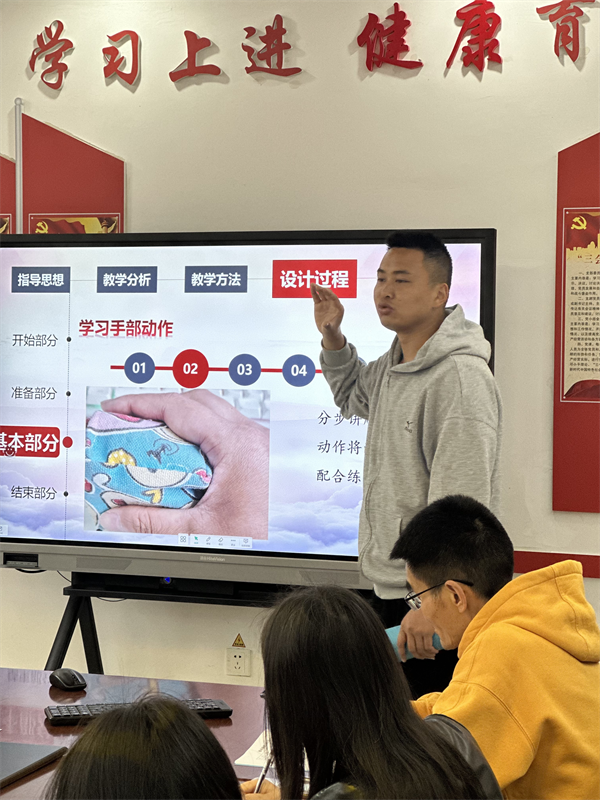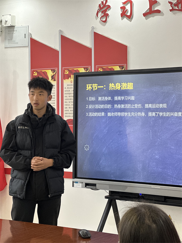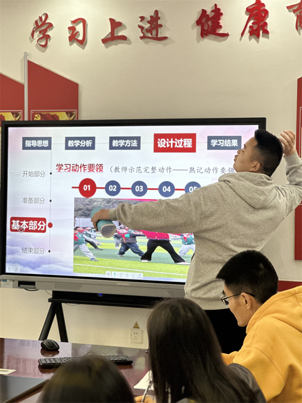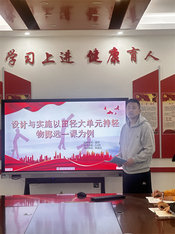 课前,体育组陈嘉乐老师围绕本课的设计思路进行了专题陈述。陈嘉乐以“设计与实施——以田径大单元持轻物掷远一课为例”为主题,从指导思想、教材分析、学情分析、教学目标、重难点突破、教学过程设计等方面展开阐述。