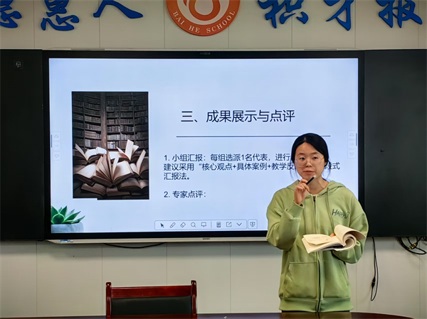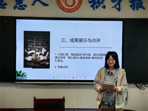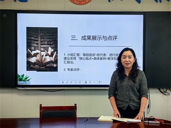 各组集思广益、畅所欲言,将所学、所思、所悟凝练为核心成果。随后进入成果展示与点评环节,贾文静老师、李彩霞老师、蒋丽老师依次代表小组分享研讨成果,从问题设计优化、生本课堂落地、思维能力培养等角度,呈现小组智慧结晶,实现经验共享、互学共进。