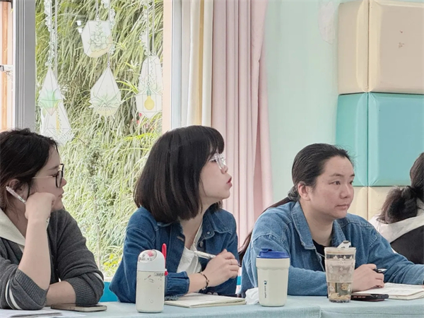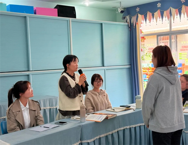 教研中,业务园长张云引导教师再次深读董旭花教授《自主游戏——成就幼儿快乐而有意义的童年》一书,聚焦自主游戏开展的前、中、后全流程支持策略,以教师实践经验为依托,展开沉浸式研讨。从前期准备、介入时机到观察指导,系统梳理出可落地、可复制的指导经验,并通过情景实操将所学经验运用到实处。