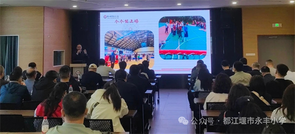 学术报告厅内,副校长杨晓斌以“用心呵护健康,以爱守护成长”为主题,从爱的味道、安全陪伴、以体树人三个维度,分享永丰小学在健康学校建设方面的具体做法与实践经验。