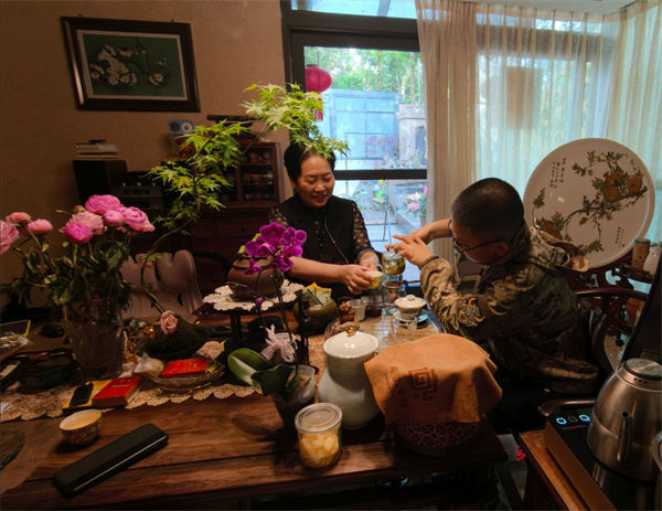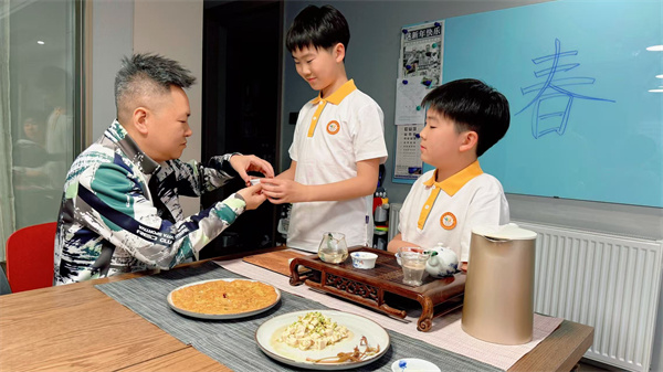 “吃春品茶”活动中,孩子们在家长指导下制作香椿炒鸡蛋等时令菜肴,并为长辈泡上一杯谷雨茶,学习茶礼,传递孝心。
