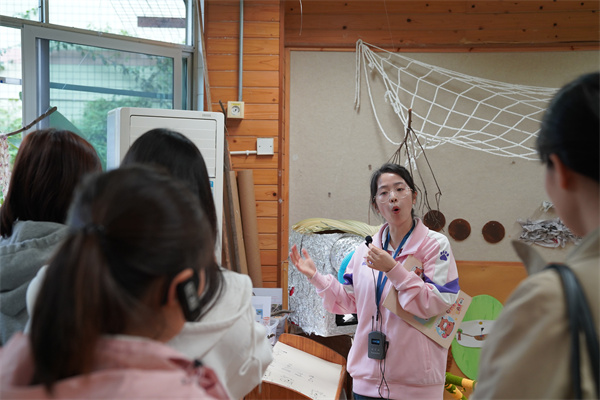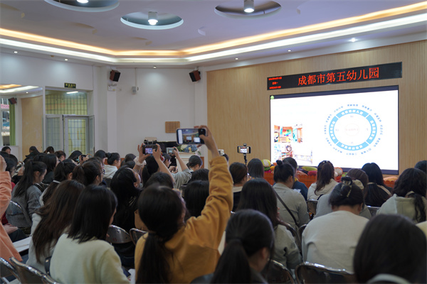 随后,成都市第五幼儿园教育集团园长陈思宏在音乐厅为老师们作了园所介绍,讲述了五幼从“广益幼稚园”到如今集团化办学的百年历程,传递出“博爱、普惠”的教育初心。保教主任刘丝雨则以“聚焦师幼互动的五幼实践”为主题,分享了幼儿园在“师生共构活动”中的探索成果。她指出,五幼始终坚持“儿童是有能力的学习者”这一儿童观,注重在真实生活场景中支持儿童主动建构经验,这与《评估指南》中“尊重并回应幼儿的想法与问题”的要求高度契合。