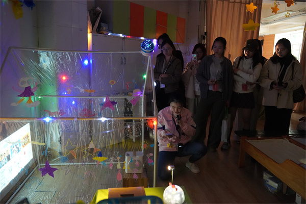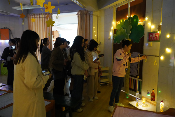 在班级环境参观环节,老师们依次走进小三班、中二班和大一班,分别观摩了“风”的主题、“光影”主题和“树”的主题环境创设。小三班的黄丹妮老师详细介绍了如何利用环境引发幼儿的互动,丰富的操作材料让幼儿与“风”玩起来,让环境成为支持幼儿主动探索的自然课堂;中二班的陈柯伊老师围绕光影主题,展示了幼儿通过手影游戏、彩色透光积木、光影小剧场等互动装置,在光与影的变化中激发好奇与表达;大一班的朱兴茜老师则以“树的主题”为例,讲解了如何通过深度观察支持幼儿在真实自然物中展开深度探究。三位教师生动诠释了环境作为“第三位教师”的角色,通过精心设计的材料投放、空间布局与儿童作品展示,不断激发幼儿的探索欲望与表达欲望。