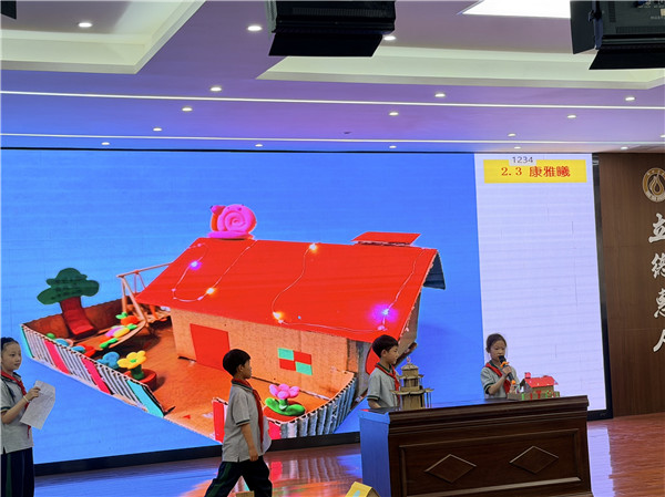 “今天,我们二年级的同学们用一双双巧手,把普通的平面图形——长方形、正方形、三角形、圆形,通过折、卷、粘,变成了一个个神奇的蜗牛的家。”小主持人们宣布二年级数学学科活动正式开始!