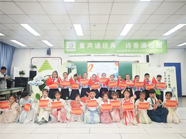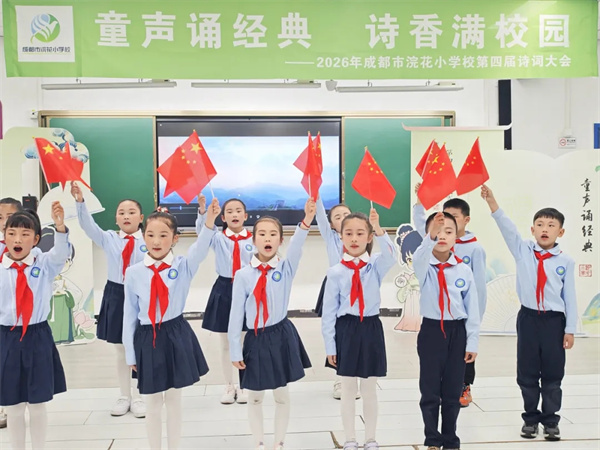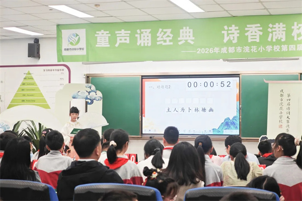 2026年4月16日,为弘扬中华优秀传统文化,激发学生对古诗词的热爱,成都市浣花小学举行了第四届诗词大会。本次活动以“童声诵经典 诗香满校园”为主题,吸引了全校师生的广泛参与,现场气氛热烈,诗意盎然。