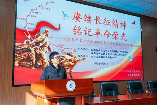 为深化革命文物叙事教学实践,4月17日,“赓续长征精神 铭记革命荣光”主题研讨活动在成都高新实验中学阶梯教室举行。北京师范大学历史学院李凯教授应邀作《高中历史教学的重难点与备考》专题讲座。成都市教科院历史教研员赖蓉辉老师、成都高新区历史教研员陈连蜀老师及全区历史骨干教师共同参加。