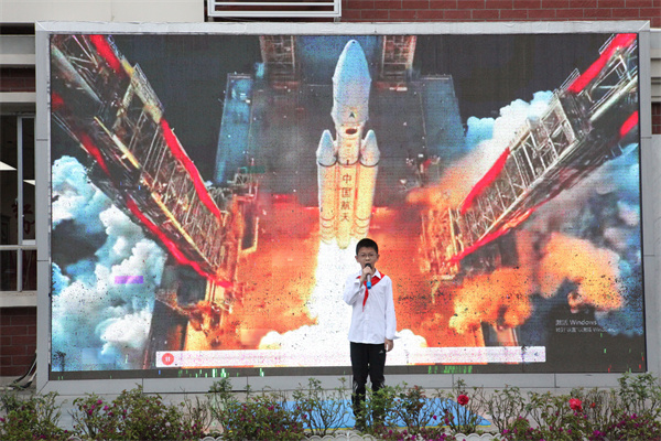 近日,成都市桐梓林小学全校师生齐聚操场,参与六年级2班承办的“逐梦星辰,问天少年”中国航天日主题思政课堂。