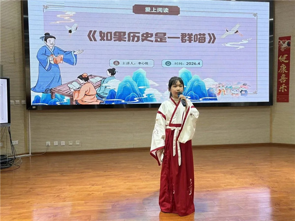 三年级的同学们在分享中尽显思考力,张洛霖森分享《夜叉守护神》;李心悦带来《如果历史是一群喵》的趣味解读;王忆楠分享《中国古代寓言》;张书炜等同学以创意讲述的形式分享《长征》。