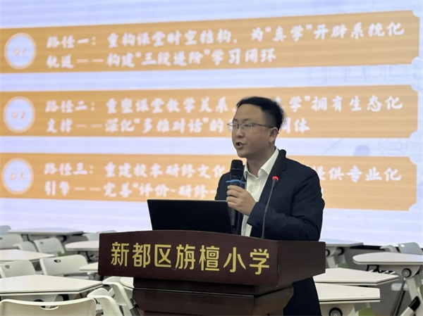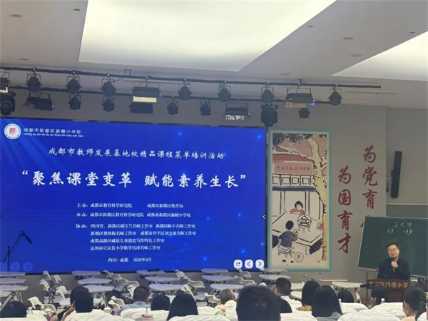 人间四月,研韵飘香。2026年4月16日—17日,成都市教师发展基地校精品课程菜单培训活动在成都市新都区旃檀小学顺利举行。本次活动由成都市教科院、新都区教育局主办,区教科院与旃檀小学承办,汇聚市、区教育专家、学科骨干教师及多区域名师工作室团队,以精品课例、成果分享、专题讲座、专家点评四位一体,全方位探索核心素养导向下的课堂变革新路径。