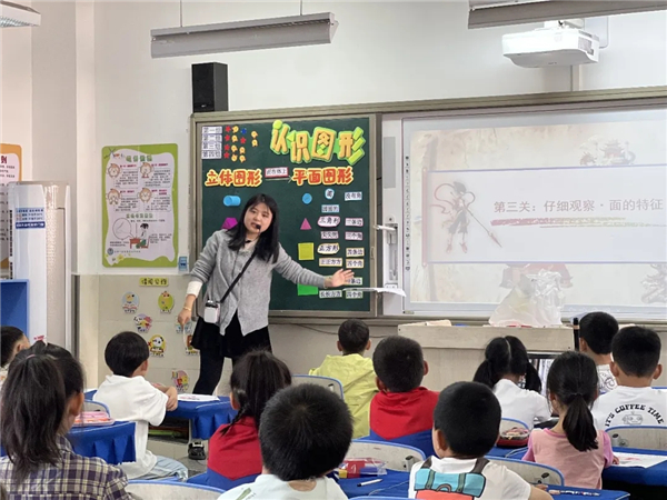 活动伊始,全体数学教师走进一年级课堂,由刘怡君老师和一年级4班的小朋友共同带来一堂“认识图形”的数学课。