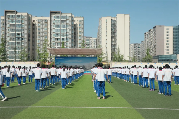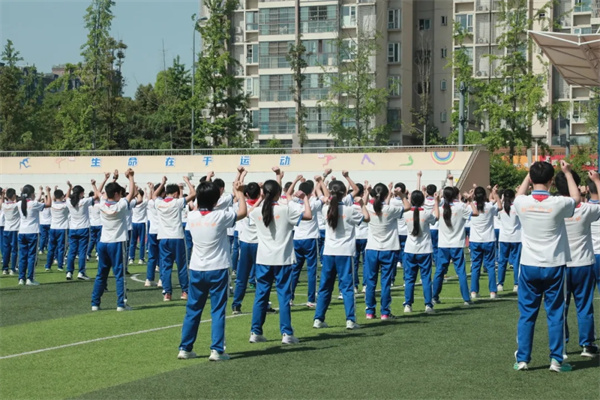 第三节下课铃响,大课间活动准时开始。新城初中的学子们首先进行集体做操,动作舒展有力,队列整齐划一。随后进入跑操环节,各班高举旗帜,迎风招展,队伍步伐铿锵、口号响亮,整个操场奔腾着青春的力量。