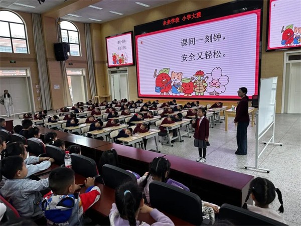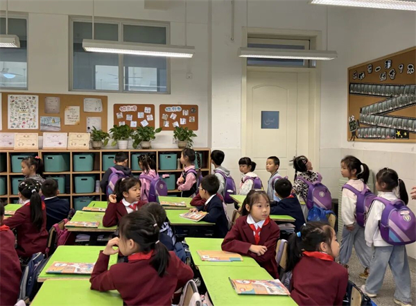 稍作休息后,大家走进了小学教室。看着整齐的课桌椅、黑板、课程表……一切都让他们充满好奇。大家亲身体验小学生的学习环境与课堂礼仪,这一刻,“上小学”不再是遥远的想象,而是触手可及的期待。带着对教室的好奇,孩子们走进了学术厅,观摩一场特别的课堂常规展示。