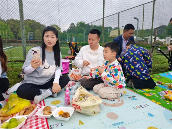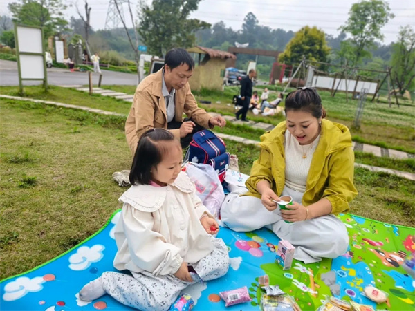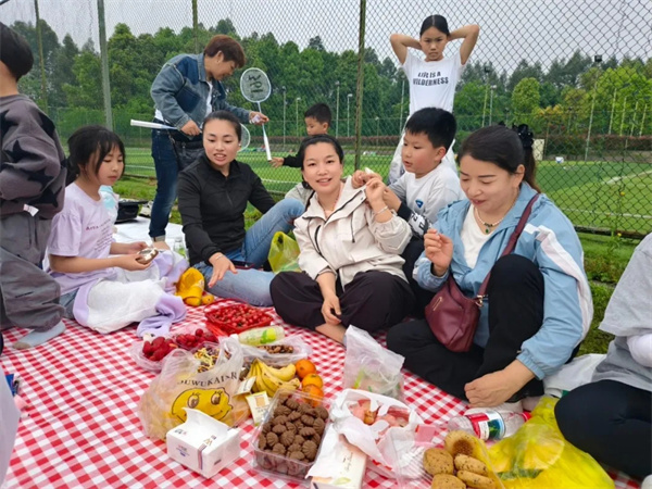 游戏之余,家长与孩子们自由结对,席地而坐。在分享美食、交流趣事的过程中,课堂上“愿意和同伴、家长分享发现”的目标化为了温暖的现实。亲子情感在协作中加深,家园桥梁在交流中巩固,春天的美好也在共享中加倍。