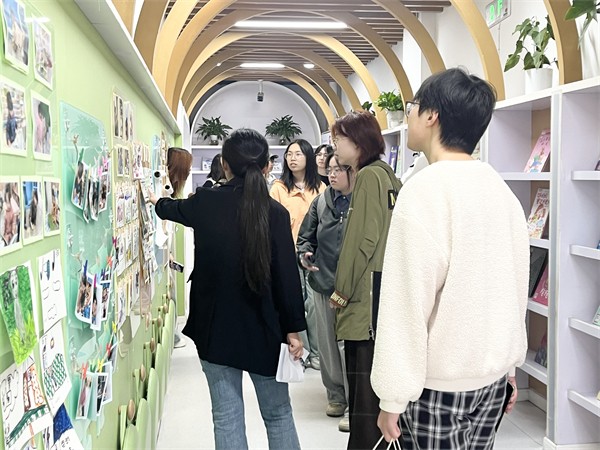 在教师团队的陪同下,川大师生依次探访园区三区三廊、大小环线等户外空间及班级教学区、艺术创想场域等区域。每一处陈设、每一面墙饰、每一个功能区都饱含儿童视角与美学巧思,非遗剪纸、扎染、泥塑等元素自然融入环境创设,让传统文化与童趣审美相融共生。师生们深入班级,近距离观摩美术项目活动的实施过程,直观感受幼儿园如何依托幼儿兴趣,将色彩、造型、材质与非遗美育相结合,以开放式、探究式的活动形式,守护幼儿的艺术天性与创造活力。