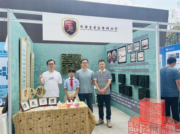 “熠熠吉金Brilliant Sacred Bronzes”主题展台,是锦城小学国际理解教育课程的缩影。学校以三星堆青铜文化为起点,从篆刻这一小小的文明载体出发,引导孩子们读懂中国篆刻“方寸之间,气象万千”的文化内涵;对比不同文明的印章艺术,理解“各美其美、美美与共”的文明多样性;亲手创作仿青铜篆印作品,用儿童的方式传承与创新传统文化。