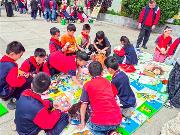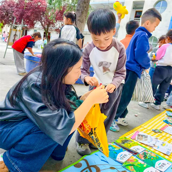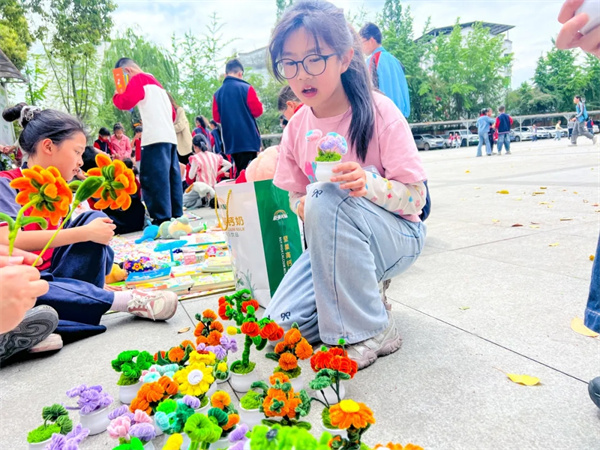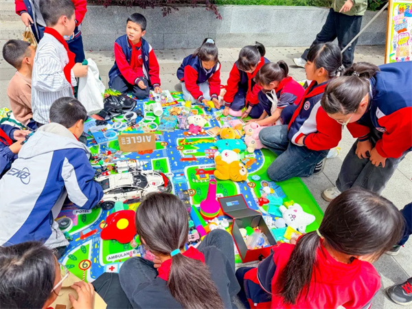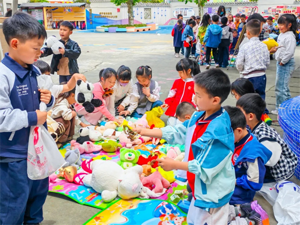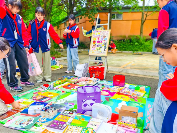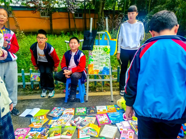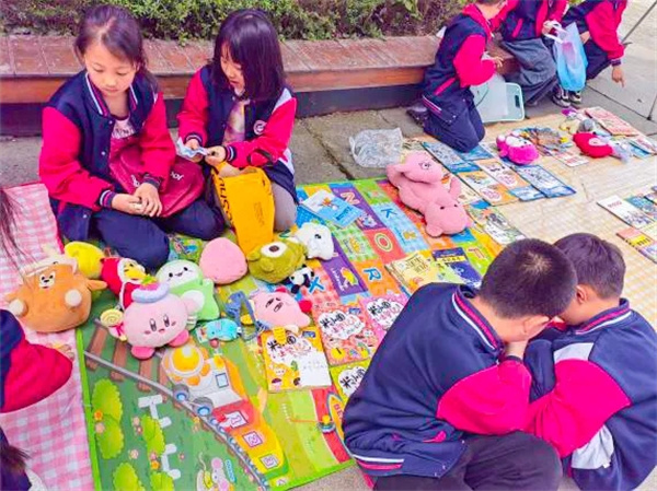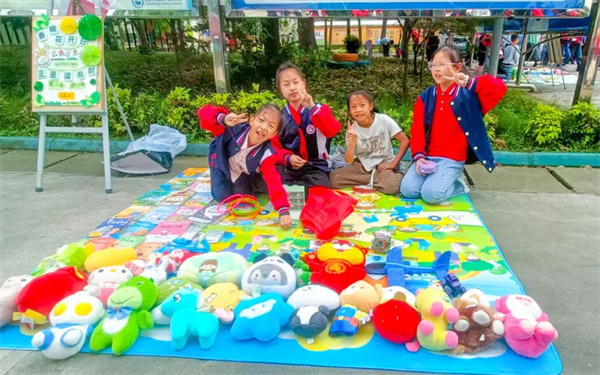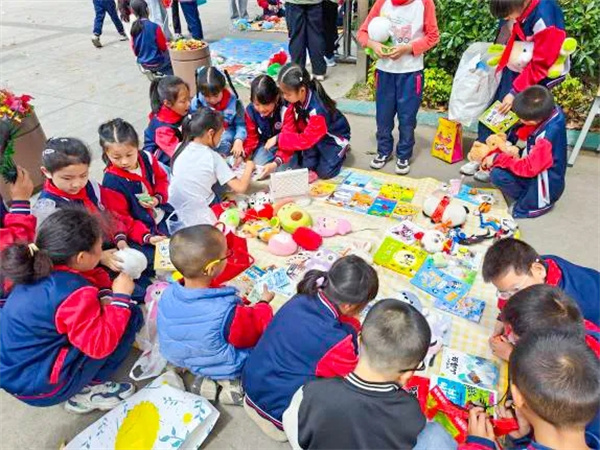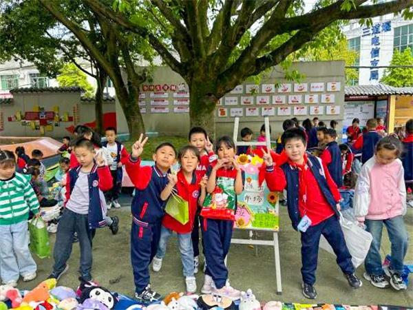 2026年4月21日下午,成都市郫都区三道堰学校的校园秒变大型童趣市集,铃声一响,小掌柜们火速就位,班级摊位整齐摆开,创意海报吸睛十足,书籍、玩偶、手工作品、盆栽、文创小物……琳琅满目,应有尽有,低至1元就能淘到宝!