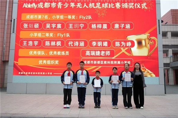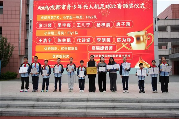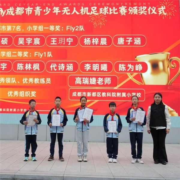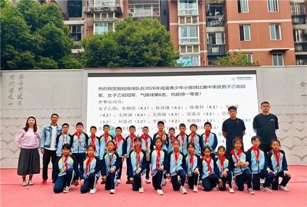 获奖表彰环节榜样引领,逐梦前行。本次表彰环节,学校为在市级赛事中斩获佳绩的附小健儿颁奖。在成都市青少年无人机足球比赛中,该校Fly2队获小学组一等奖(成都市第7名),Fly1队获小学组二等奖,学校获评优秀组织奖,高瑞婕老师获评优秀领队、优秀教练员。在2026年成渝青少年小排球比赛中,该校排球队荣获男子乙组冠军、女子乙组冠军、气排球第6名,均获一等奖。一份份荣誉,是对孩子们拼搏精神的最好嘉奖,也是对学校素质教育成果的有力见证。