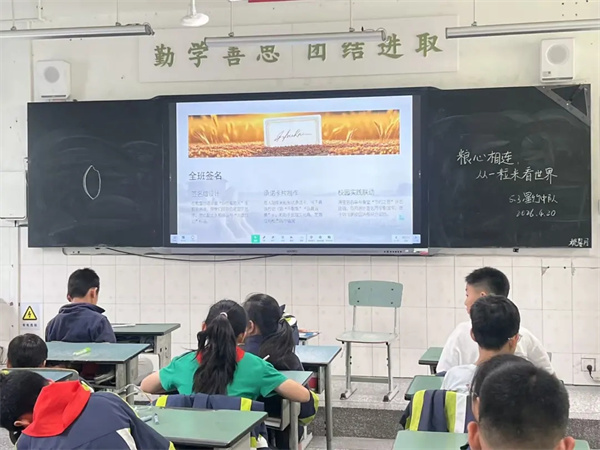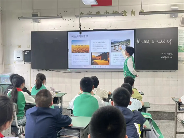 课堂上,老师以非洲饥饿儿童与学校食堂剩饭桶的对比导入,瞬间触动了孩子们的心灵。随后,一组组震撼数据让孩子们深刻认识到:全球每年浪费约13亿吨粮食,而仍有7.35亿人面临饥饿。通过中国、美国、印度、非洲国家的“粮食故事”分组探究,学生们了解到不同国家面临的不同粮食挑战,初步建立起“人类命运共同体”的意识。