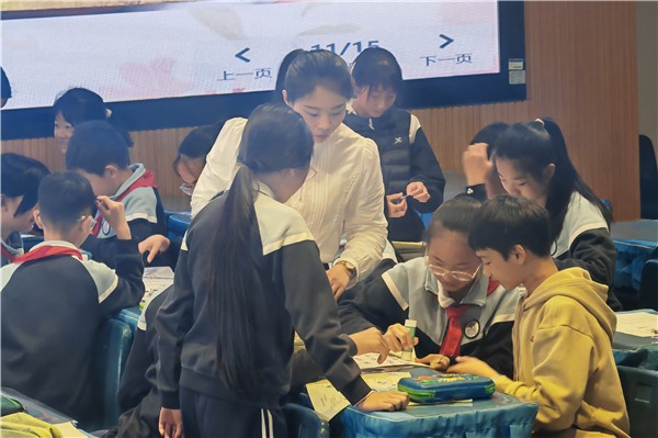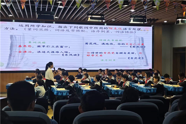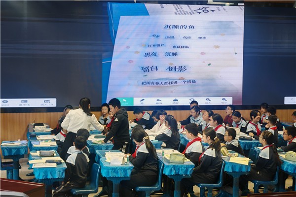 语文课堂上,老师以“春”为载体,将猜字游戏、春日诗词诵读、陌生化写作技法讲解与拼贴诗创作出彩结合,打破传统课堂的沉闷,让孩子们在趣味互动中大胆想象、主动表达,一笔一画、一词一句,都是童真与诗意的碰撞。