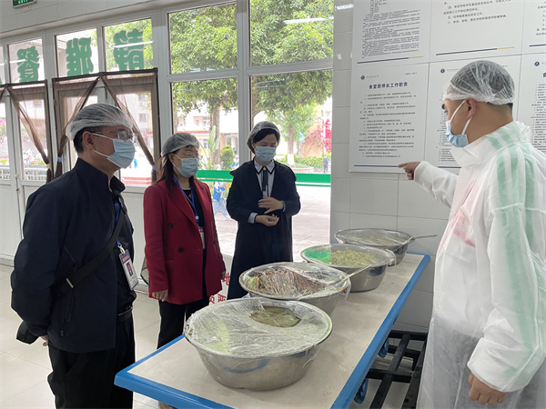 随后,督学一行前往学校食堂,重点检查食品安全管理工作。在食堂现场,督学们仔细查阅了员工信息档案、公示栏内容,详细询问了食品采购、加工、留样等环节的管理流程,严格对照学校食品安全与营养健康管理相关要求开展检查。督学们对食堂公示菜品信息、食材来源等内容的完整性、规范性给予肯定,同时指出,员工信息档案仍需进一步完善,要严格落实从业人员健康管理制度,确保信息详实可查,切实筑牢校园食品安全防线。检查结束后,督学们参与品餐环节,实地感受学生餐的口味与营养搭配情况。