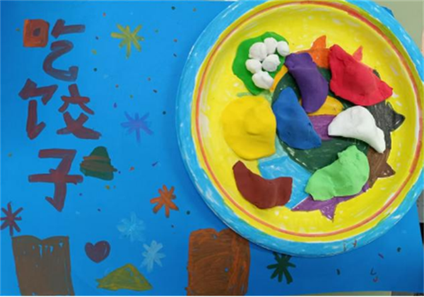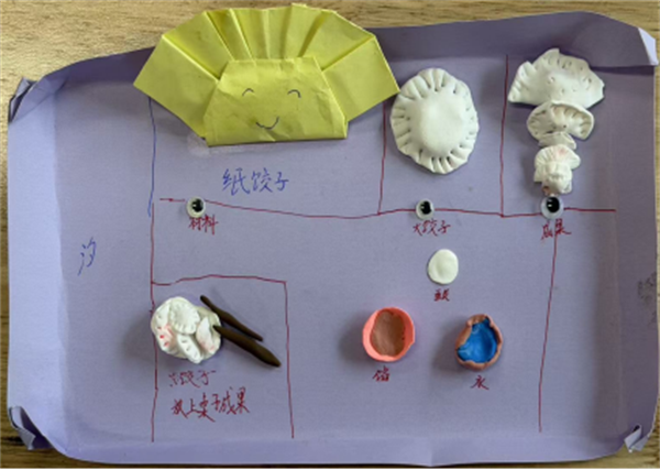除了亲手制作饺子,孩子们还发挥奇思妙想,用彩纸、黏土创作了一幅幅充满童趣的饺子主题作品。有的给饺子画上了可爱的表情,有的搭配了烟花、爱心等装饰,还有的用彩泥捏出了色彩缤纷的饺子造型。一张张作品,既展现了孩子们的创意与想象力,也饱含着他们对饺子、对传统文化的喜爱。