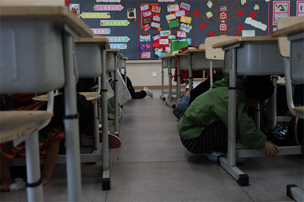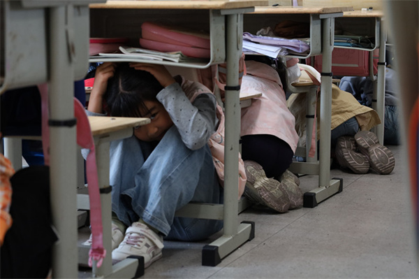 上午10时整,急促的防震警报声准时在校园响起,演练正式启动。听到警报后,各班级学生在老师的快速指挥下,立即双手抱头、弯腰低头,迅速躲避到课桌下方,完成规范、冷静的紧急避险。待避险环节结束,疏散指令下达,各班学生在老师带领下,保持双手护头、弯腰低姿的姿势,沿预定疏散路线快速、有序地向指定安全集结区域撤离,整个过程中,学生不推挤、不喧哗、不逗留,展现出良好的纪律意识。