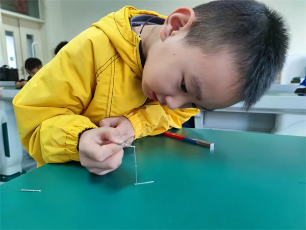 电磁感应、摩擦生电、磁悬浮现象、放大镜聚光点火……一个个有趣的小实验,都是他的快乐源泉。他常常自己准备材料,反复尝试、认真观察、仔细记录,哪怕失败也不放弃,一定要找到原理、做出结果才肯停下。
