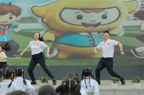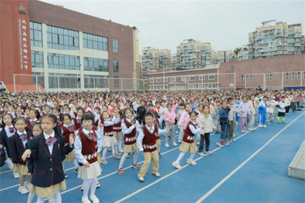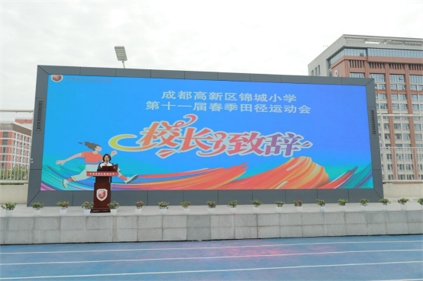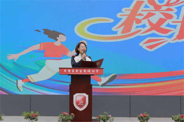 锦城小学党支部书记、校长李雪梅致辞,倡导“健康第一”教育理念,鼓励孩子们在运动中强健体魄、磨砺意志,乐享运动、收获成长,希望每个锦小娃都眼里有光,身上有汗。
