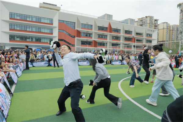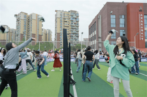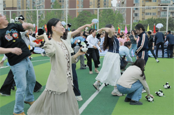 老师们放下粉笔,换上运动鞋,抛起毛茸茸的小熊猫玩偶。一只只小熊猫在空中划出歪歪扭扭的弧线,满场飞腾。老师们跑着、接着、笑着,在运动中忘却烦恼,尽情体会纯粹的快乐。