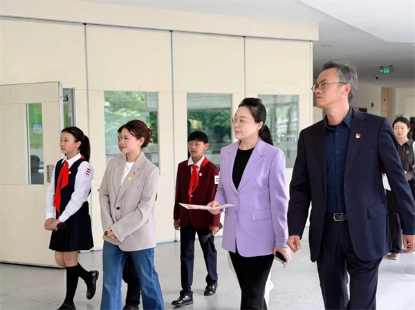 孟春一行沿着校园“红色地图”沉浸式参观。校党总支书记、校少工委主任芶鹏,校党总支专职副书记、校少工委副主任袁华,围绕学校办学理念、育人目标与少先队工作开展情况作整体介绍。