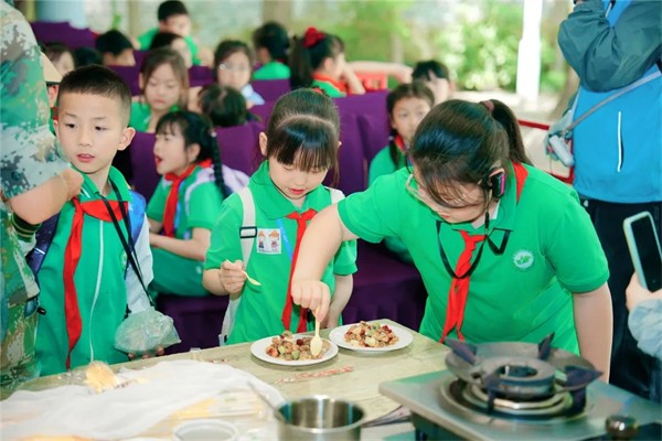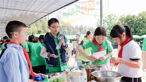 大地厨房里,同学们分工协作,搭炉灶、理食材、巧烹饪,在烟火气中体会劳动的艰辛与快乐,践行“光盘行动”,传承勤俭节约美德。