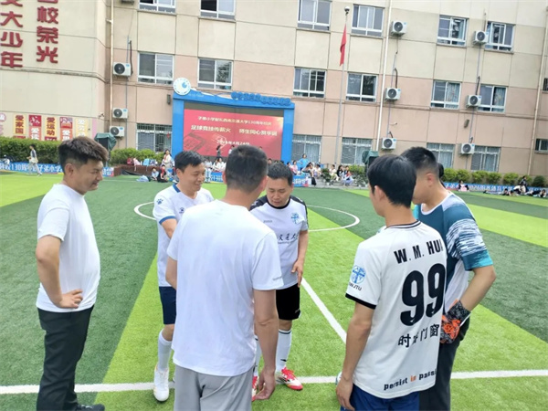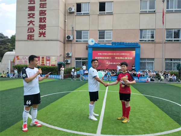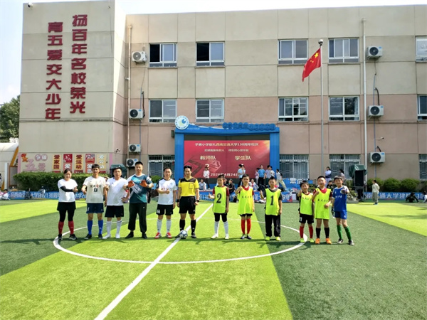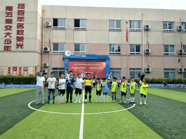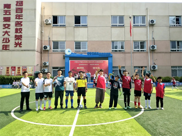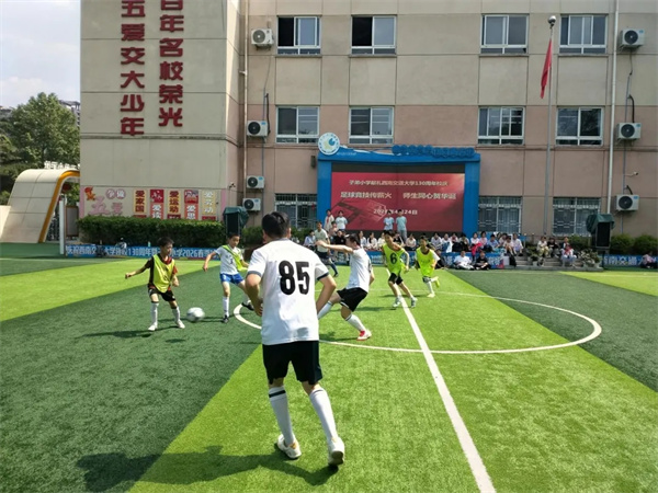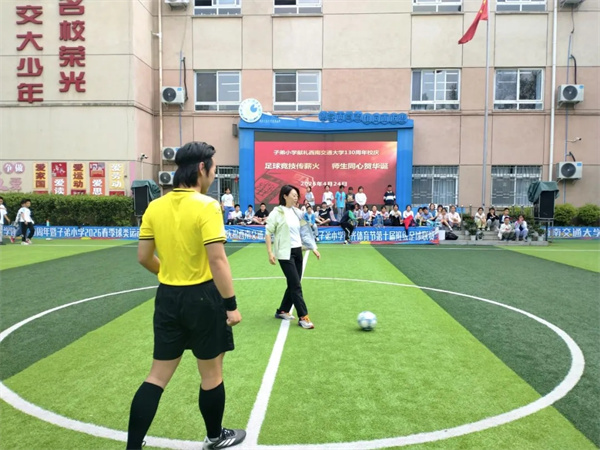 为热烈庆祝西南交通大学建校130周年,深入践行“健康第一”的教育理念,引导师生树立正确政绩观,营造团结奋进、活力向上的校园氛围,4月24日下午,由西南交通大学子弟小学工会精心组织的“足球竞技传薪火,师生同心贺华诞”师生足球友谊赛在学校足球场激情开赛。全体参赛师生以球会友、以赛传情,用绿茵场上的奔跑与呐喊,为交大130周年校庆献上了一份充满活力的祝福。