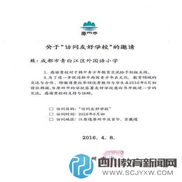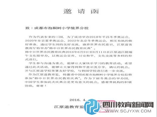 在四川电视台《阳光起跑线》的协助下,目前,已有两所优秀学校收到了来自韩国江原道政府及省教育厅发出的活动的邀请函,届时青白江外国语小学、泡小境界分校将派出部师生将前往韩国江原道与韩、日学生及当地市民一起参加各种丰富多彩的活动,并签订友好学校。和他们共同在学校上课、交流,得到不一样的学习机会,为培养国际化的人才打下基础。